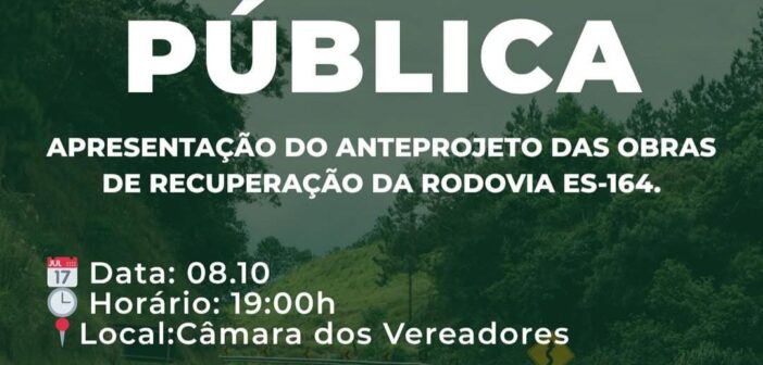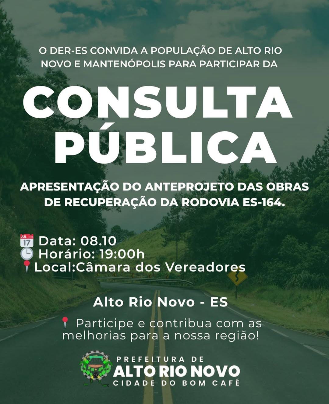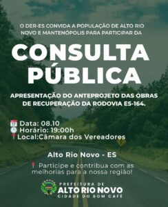 O Departamento de Edificações e de Rodovias do Estado do Espírito Santo (DER-ES) convida toda a população de Alto Rio Novo e Mantenópolis para participar da Consulta Pública de apresentação do anteprojeto das obras de recuperação da rodovia ES-164.
