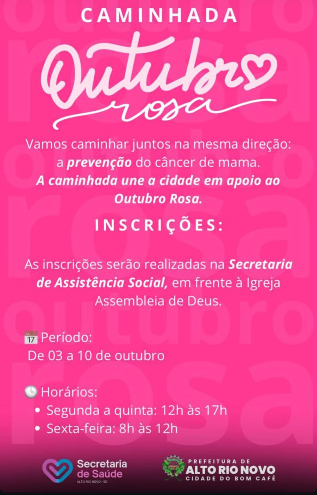 A Prefeitura Municipal de Alto Rio Novo, por meio da Secretaria Municipal de Saúde, convida toda a população para participar da Caminhada do Outubro Rosa, em apoio à campanha de conscientização e prevenção ao câncer de mama.